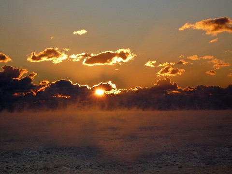 気温は低く寒かったですが、風がなくて海は凪いでいました。上空は晴れ渡り、天空には下弦の月が輝いていますが、残念ながら水平線上には雲が拡がっていました。風がなく、暖かい海水からの水蒸気が冷たい空気に触れて、次々に海霧が沸き上がってきます。