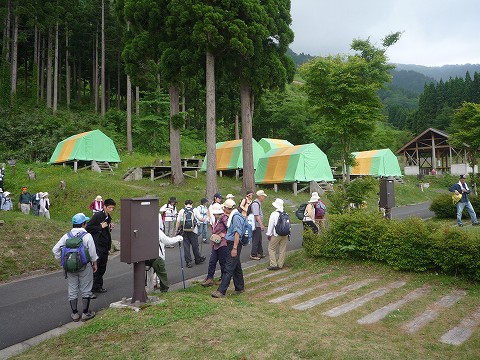 若鬼くん、桜子ちゃん、和太鼓の演奏者に見送られてボランティアガイドさんと山歩きを開始。