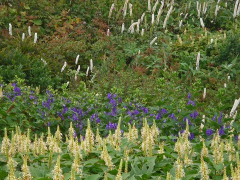 登山道に入って早速にアケボノソウ、サラシナショウマです。そしてまだルリトラノオが少し残っていました。 |