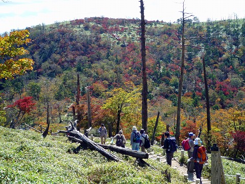 | 日出ヶ岳からは続く正木嶺の緩やかな盛り上がりと紅葉がまたまた素晴らしい。正木嶺を越えると広々とした正木ヶ原。 |