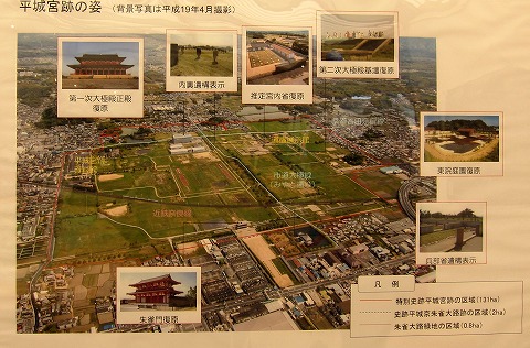 | 平城京の最初の太極殿(第1次)、聖武天皇が都を転々とした後に戻って造った太極殿(第2次)は右の方。まだ復元されてません。 |
