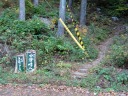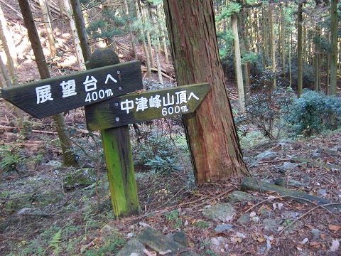 | しゃくなげ園に下りるコースで不思議な道標を発見。左に登ると展望台・・・これは来た道で間違いなし。ところが右に下りると中津峰・・・えーっ、嘘でしょ。 |