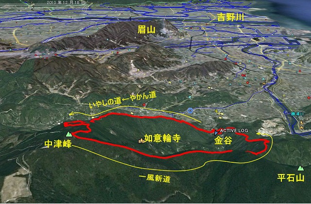 徳島市内=金谷ー(やかん道)-引き返し-(いやしの道)-山頂-(一風新道)-金谷=徳島市内