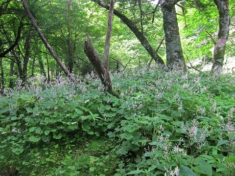 | 穴吹川源流の付近ではカニコウモリが群生。そして花の終わったオオヤマレンゲ、緑色のは実でしょうか? |