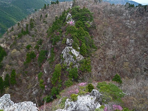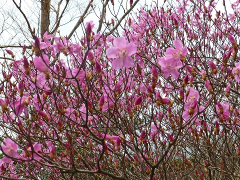 | 今年は花の咲き方が例年と異なるようです。途中の登山道のカタクリもまだ葉がみられるだけでした。これまでだと、ミツバツツジとかカタクリの花とアケボノツツジはほぼ同時に咲いていたのですが・・・心配しながら到着した大岩のアケボノツツジ。樹によって満開に近いもの、蕾のものと差はあるが、全体としては五分咲きでしょうか。 |