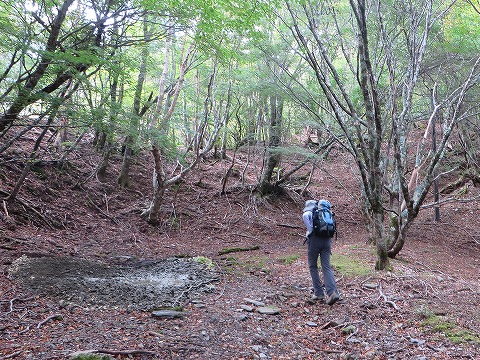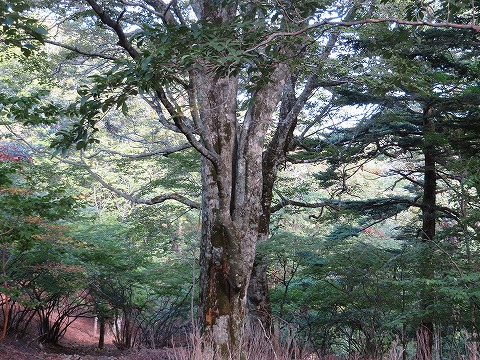 | 一ノ森ヒュッテ前で小休憩し、剣山龍光寺から登った道を引き返します。最後の林道とクロスするところで、登山道から離れて林道に入ってみました。 |