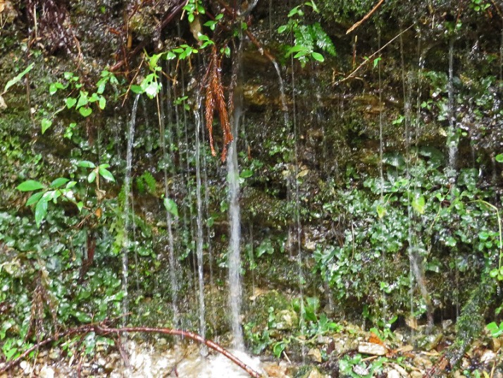 大雨の後、沢と滝の増水だけではなく岩壁のあちこちから水が流れ出して、林道の上にも水流ができています。