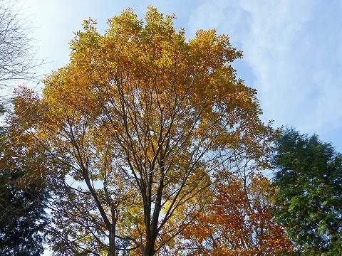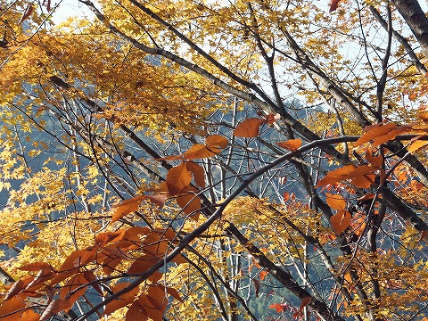 | 相栗峠へとひたすら下ります。杉・檜の林もなくなり、やっと日当たりが出始め、きれいな黄葉(紅葉)も見られるように。途中には広々としたヒメシャラの林も。 |