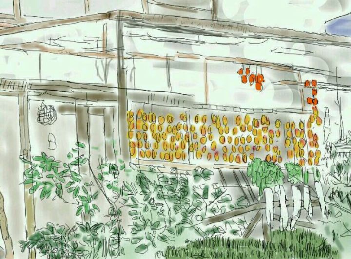| 竹林、茶畑の中を登っていくと、廃屋も混じる農家があります。つるし柿、大根を干している農家の庭をタブレット絵に(^_^;)。 竜王山キャンプ場への車道とクロスしながら登山道に入っていきます。 |
