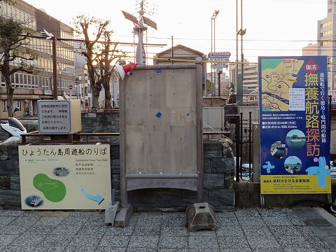 文化会館前で予約乗船客を待つが現れず。予約内容を間違えたらしい。また客は我々だけで戻ります。 |