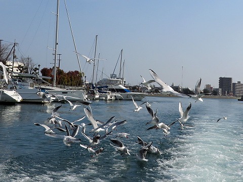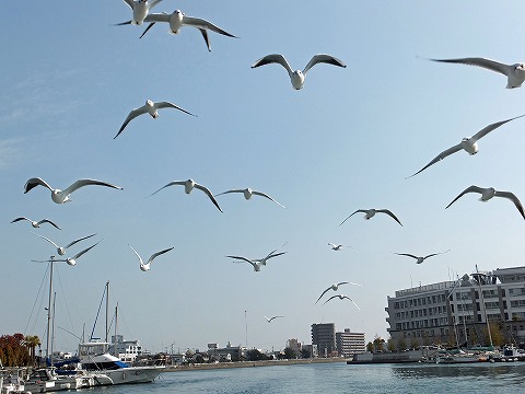 | 新町川に戻ったところで、投げた餌にユリカモメが群がってきます。 |