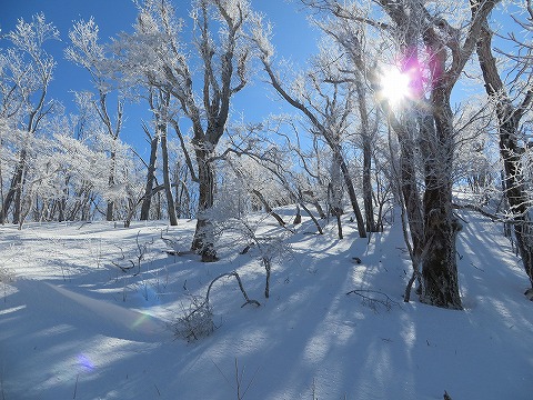 lここを越えて稜線に出ると一段と霧氷が見事。 |
