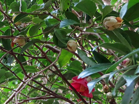 近くの庭にある大きなサボテンは元気に冬を越したようです。実も落ちたまま。昨年、この実をいたずらして、細かい透明の 棘がささり往生しました(;_;)。 |