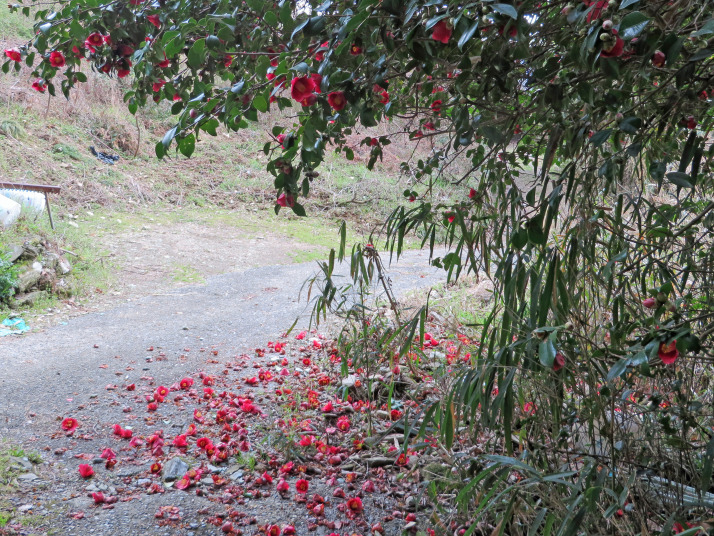植物園に下りる道を見送り、久しぶりにミカン畑コースへ直進。ここもイノシシ被害が多いのか罠を置いてありました。ヤブツバキが満開、ただミカンの木は切り倒されたようです。 |