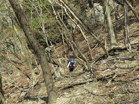 私たちは対岸の大岩から迂回して谷に下りたが、実は大岩を下りる事ができるらしい。数人の方が岩の上におられました。 |