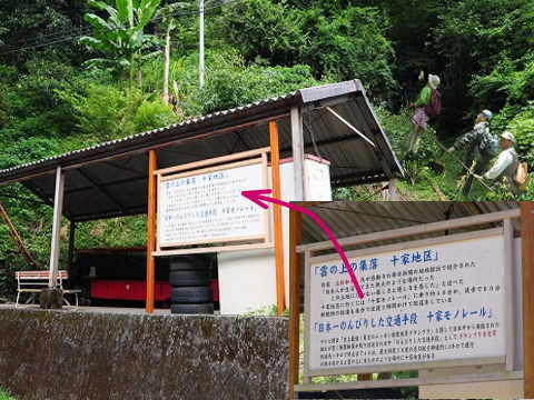 続いて、十家集落へのイベントです。岩戸温泉から車道を少し歩いて切越発電所前から山道を登ります。登り口にはモノレールの乗車場があり、立松和平さんが「雲」の上の集落として毎日新聞で紹介した話、テレビ朝日での放送などが紹介されています。 |