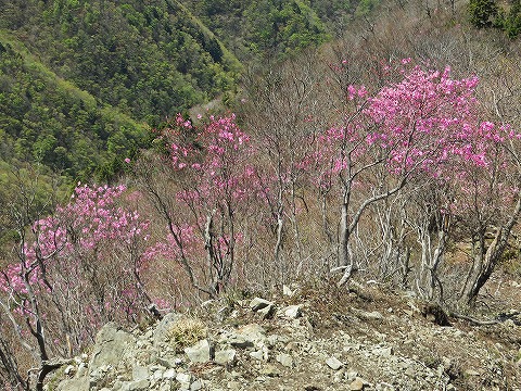 山頂までの登山道、谷を挟んだ山腹にアケボノツツジのピンクが見えます。