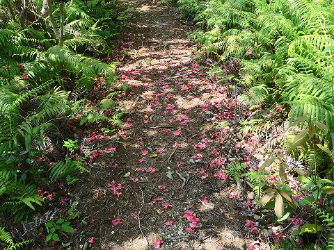 オンツツジの花が散り絨毯になています。谷向こうの山腹のオンツツジの花は全く見えません。 |