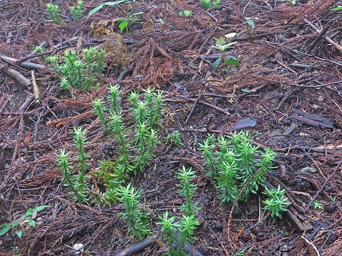 | いやしの道を約1時間で山頂。秋に備えてチャボホトギス、ヤマジノホトトギス、ツルリンドウの葉が元気に拡がり、9月頃にはチャボホトギスを楽しめそう。 |