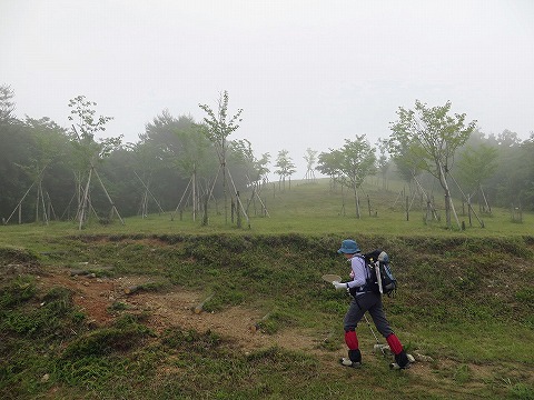 登山口は今回は18℃と少し気温が高め。霧が立ちこめて林の中が幻想的。 |