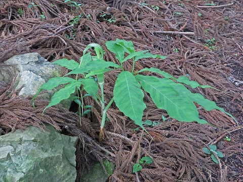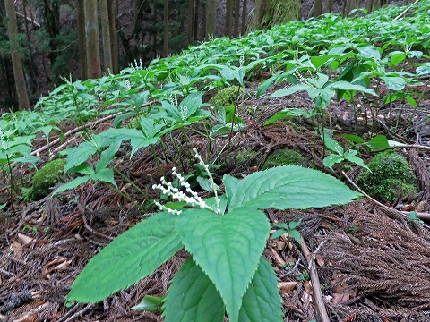 今回は行かなかった山荘分岐から東照神社への急登にはトリカブトが群生しているが、こちら三つ尾峠への道にはフタリシズカが大群生。