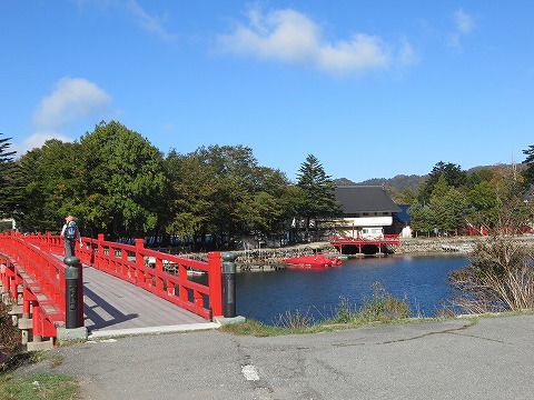 赤い橋が大沼に映える赤城神社。この場所は小鳥ヶ島で、 1970年にもとの大洞から移されたそう。創建は不詳で祭神は、赤城大明神、大国主命、磐筒男神、磐筒女神、経津主神、豊城入彦命との事。社伝では、允恭天皇・用明天皇の時代に社殿を創設したとなっているらしい。 |