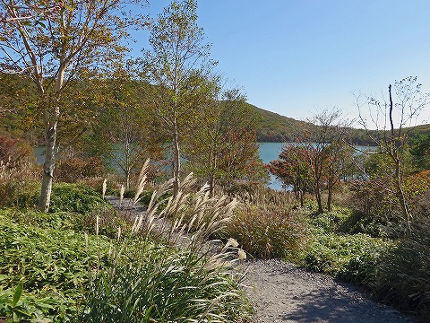 | 車に戻り、小沼に移動。小沼で遅めのおにぎり昼飯をとって浅間山の宿泊 高峰高原ホテルを目指します。途中の下っていく車道で白樺樹林に巻き付いたツタが紅葉し、日光できらきらと輝いています。 |