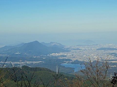 瀬戸内海側に開けていて、象頭山、満濃池など。霞んでいるが、遠くに見えているのは丸亀城跡かも。 |