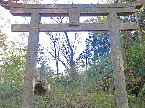 峠には、垂れ乳の「あめのうずめのみこと」と猿田彦の石像が置かれています。なんでも天保年間に据えられたとか。少し離れてある石の標識は字が読めず、なにか不明です。 |