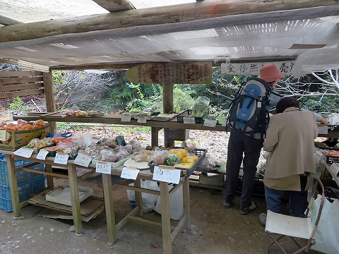 | 金谷駐車場には無人販売所がありますが、今日はいつもより沢山の野菜。果物が並び、おばさんがおられました。 |