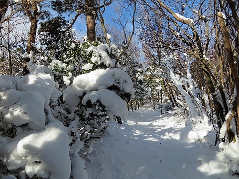 | 三角点の旭ノ丸までは歩きやすい。積雪に日が当たり、木の陰とのオブジェが素晴らしい。 |