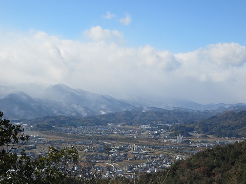日の峰山(芝山)からは雪で白く霞のかかったような大川原高原そして中津峰山がいかにも寒そうです。 |