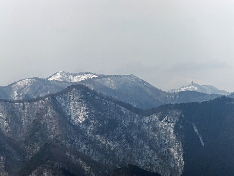 ミツバツツジの林、積雪は締まっていて歩きやすい。アイゼンは不要。天岩戸別神社の石柱を通り過ぎて、鉄塔のある見晴らし地へ寄り道。 |