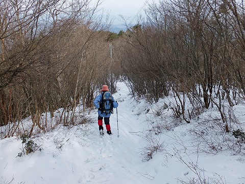 | 展望地から引き返して、我が家のダイニングへと降りていきます。雪があり歩きやすくなった藪道を降りていきます。 |