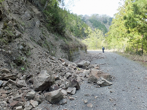 旗立山から林道に下山。駐車場までの林道のあちこちに真新しい落石・土砂崩れ。大小取り混ぜた石が転がり、ちと怖い。上には、まだ落石予備軍が控えているようです。 |