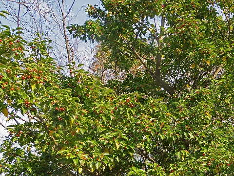 泉の縁にあった木は?実がいっぱいついて、葉も少し色づいています。根っこも地表にごつごつ出ていて迫力あり・・・なんの木でしょう?