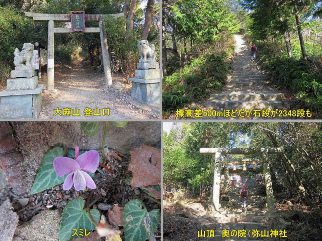 山頂の奥の院(弥山神社)まで標高差は約500mだが、表参道は石段が多く、なんと2348段もあるらしい。
