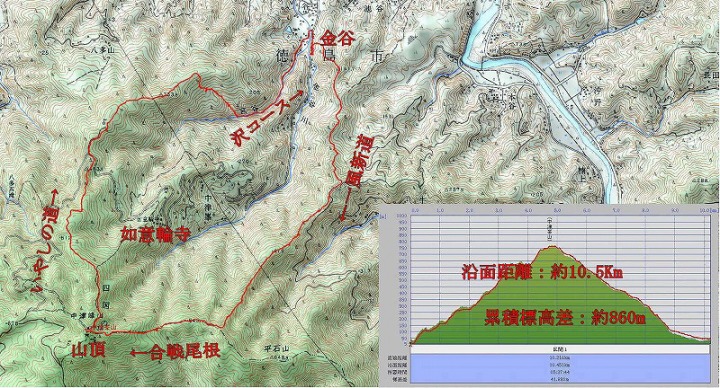 徳島市内=金谷-一風新道-お地蔵-合戦尾根-山頂-いやしの道・ヤカン道ー金谷=徳島市内