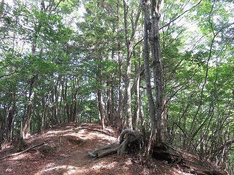 登山道、尾根道は林の中、木陰になっていて気温も25度ほど、気持ちの良い風もあり快適です。 |