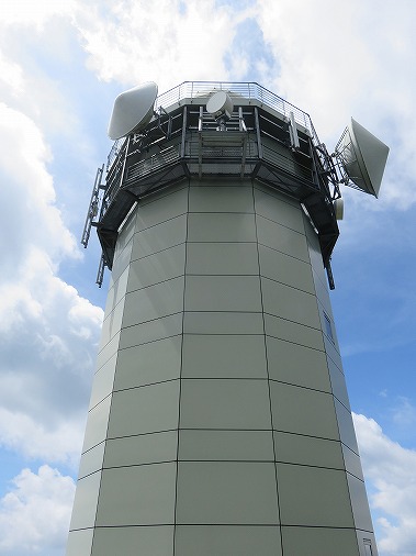 | 山頂標識の先には雨量レーダー施設。更新工事が始まっているが、大工事のよう。大型クレーンを置くための工事をしていた。作業者はファガスの森に滞在しているらしい。 |